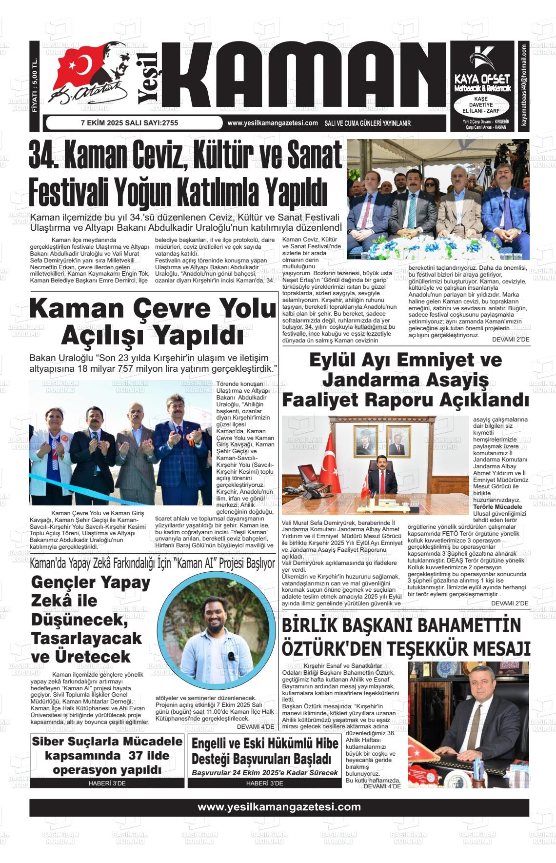 Kırşehİr Yerel Gazeteleri 07 October 2025, Tuesday Günü Manşeti